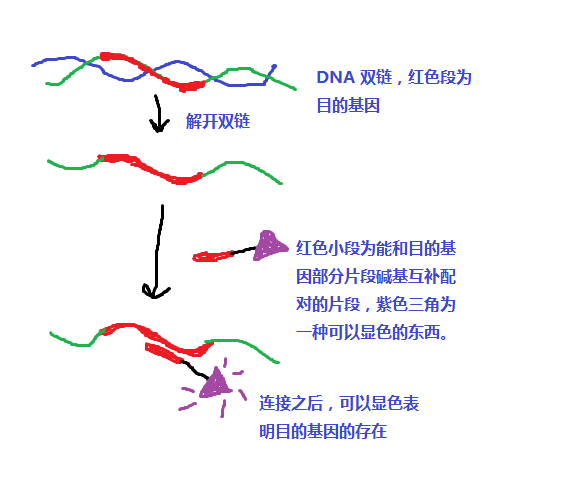 ภายใต้ค่า pH อุณหภูมิ และความแรงของไอออนิกที่เหมาะสม หัววัด DNA สามารถพันธะไฮโดรเจนกับ DNA หรือ RNA สายเดี่ยวที่ไม่มีป้ายกำกับที่เสริมกันในตัวอย่างเพื่อทดสอบโดยใช้ความแม่นยำสูงของการเปลี่ยนสภาพของโมเลกุล การเปลี่ยนสภาพ และการจับคู่ฐานเสริม รวมกันเป็นคอมเพล็กซ์สองควั่น